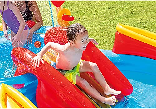 - Center includes water slide, wading pool, water sprayer, ring toss game (with 4 inflatable rings)
