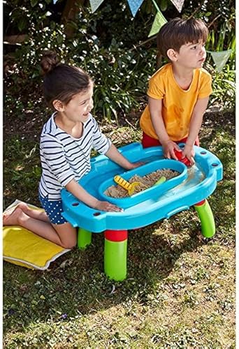 - Just the right size for your little explorers and adventurers, this sturdy sand and water table can be either used on the floor or raised up on its legs. Cleverly designed with a water run around the outside of the sand pit for lots of splashing about, sculpting and pouring fun. Included is a rake, scoop and boat to play with, plus a lid to keep the pit covered between playtimes.